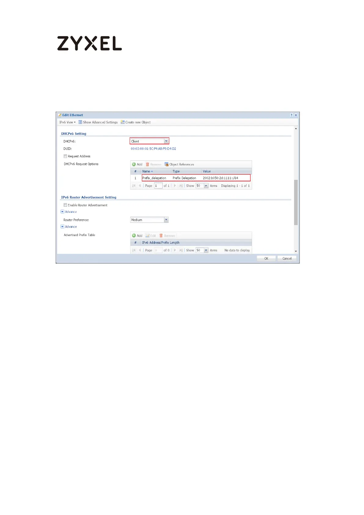 3. In the Advertised Prefix from DHCPv6 Prefix Delegation table, click Add and select