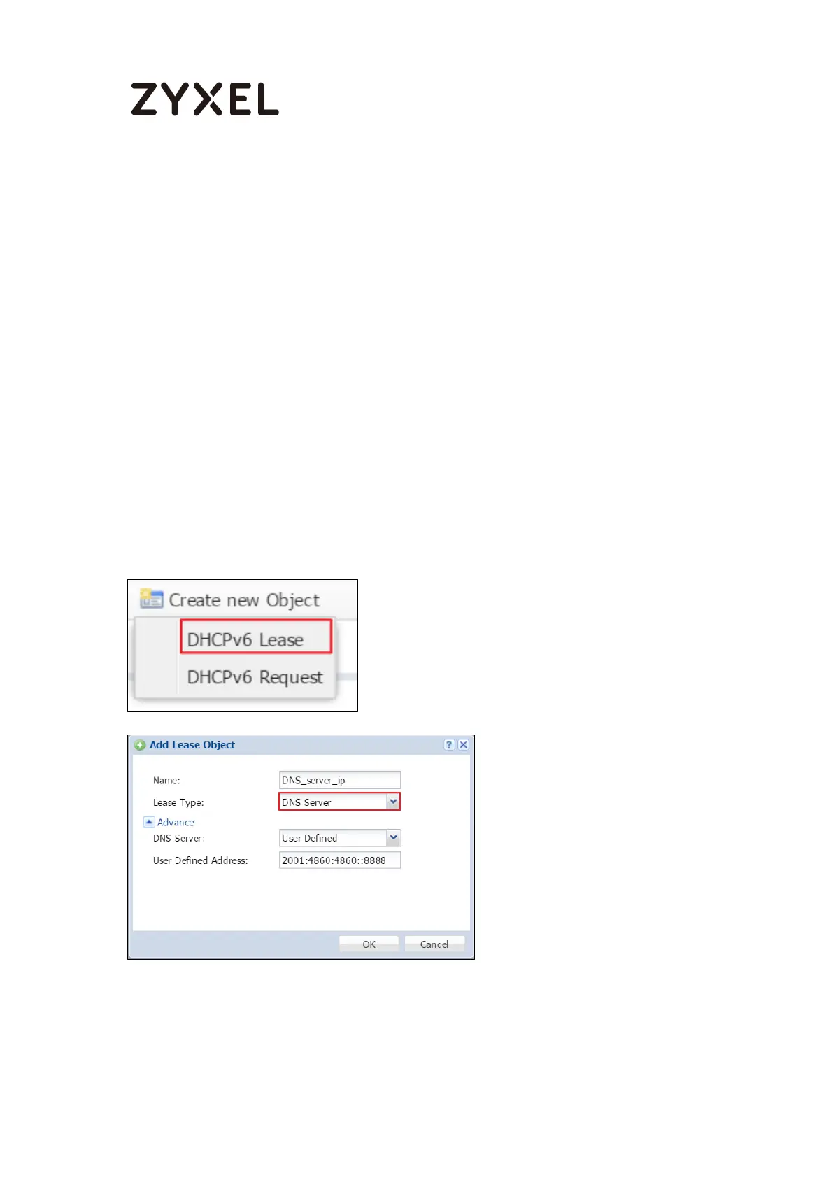 Select DHCPv6 Lease and DNS server as lease type. For example set