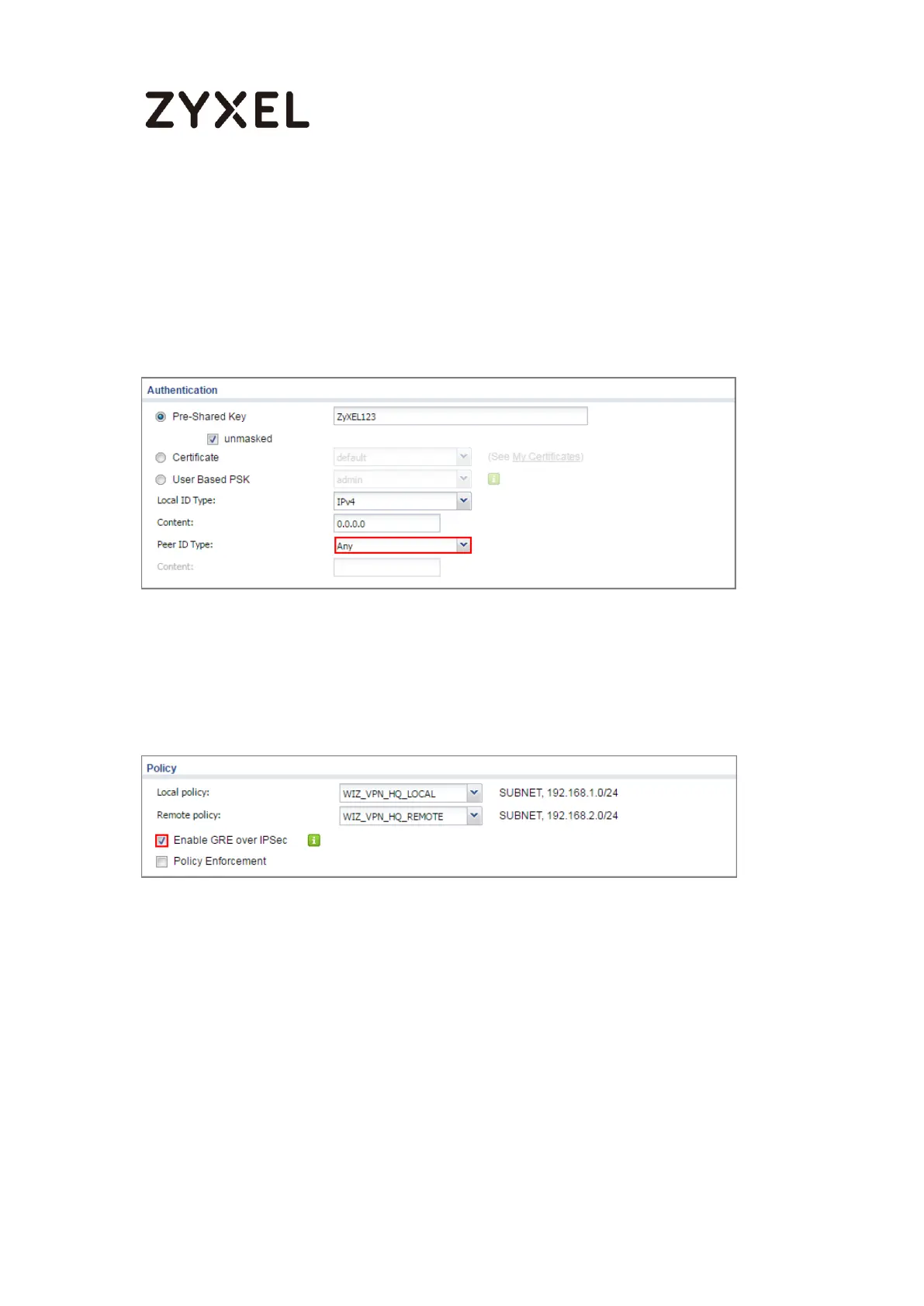 Settings. Configure Authentication > Peer ID Type as Any to let the ZyWALL/USG