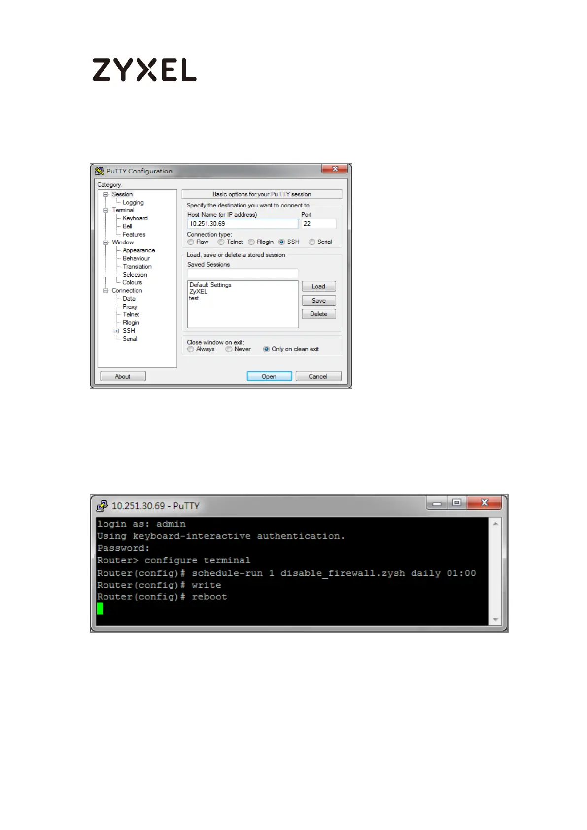 Router(config)# schedule-run 1 disable_firewall.zysh daily 01:00