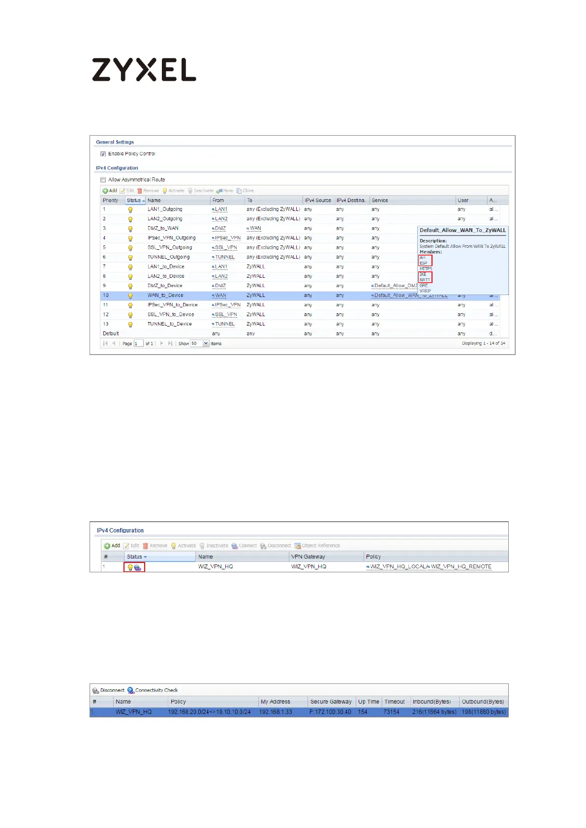 Go to ZyWALL/USG MONITOR > VPN Monitor > IPSec and verify the tunnel Up