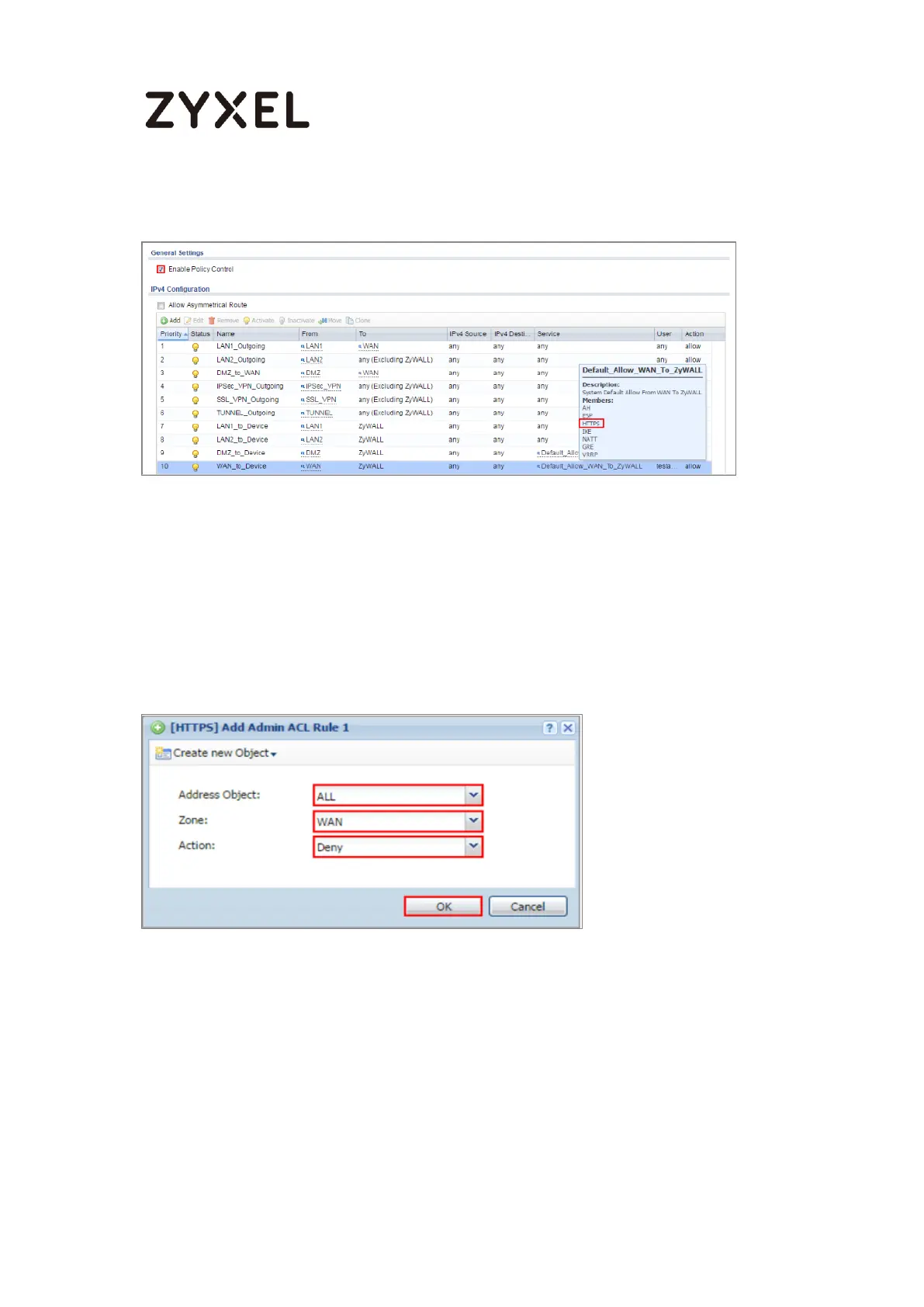 ACL Rule 1. Set the address access action as Deny for ALL address in WAN.
