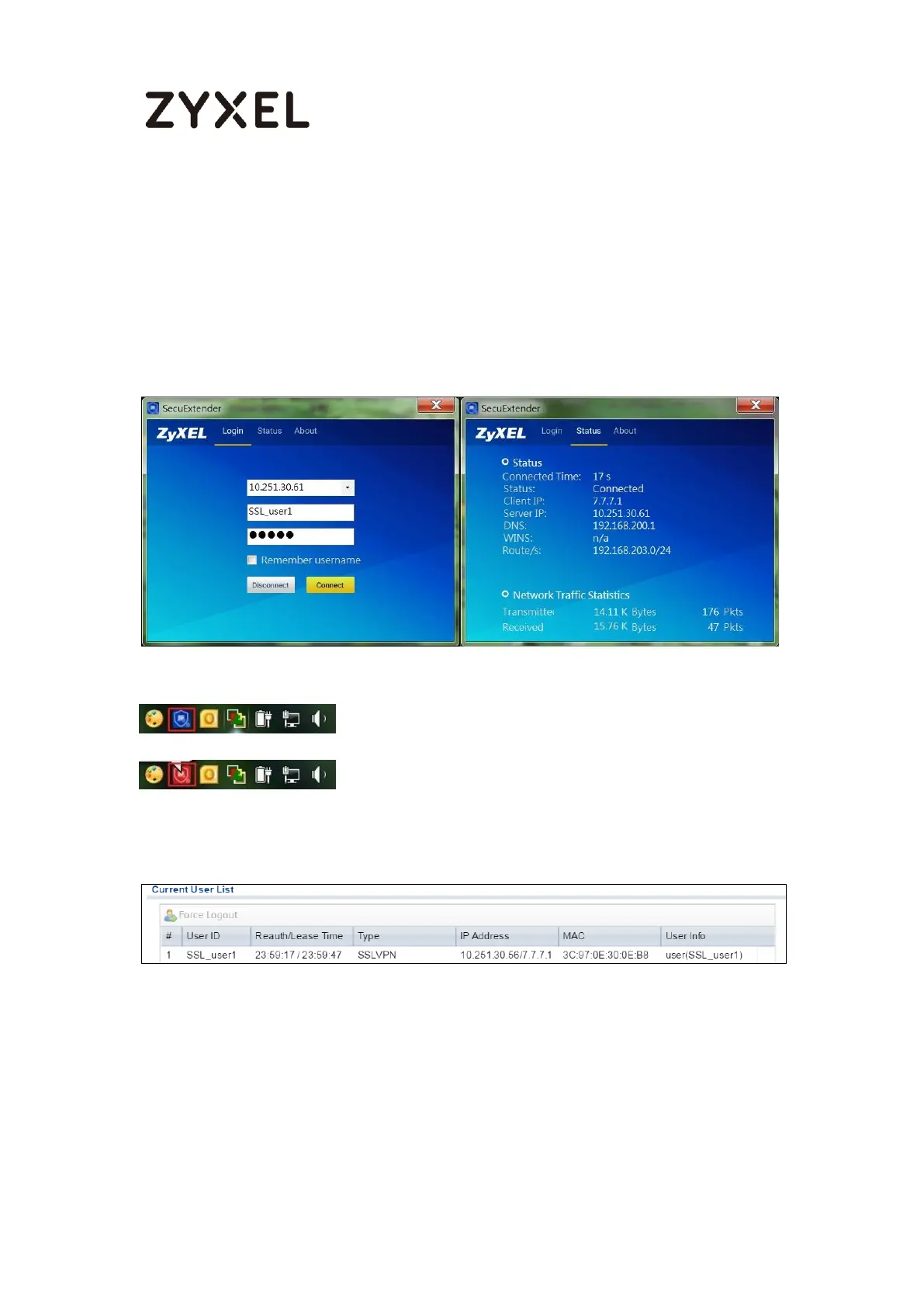 and password to connect to the server. The example below shows that the client IP is