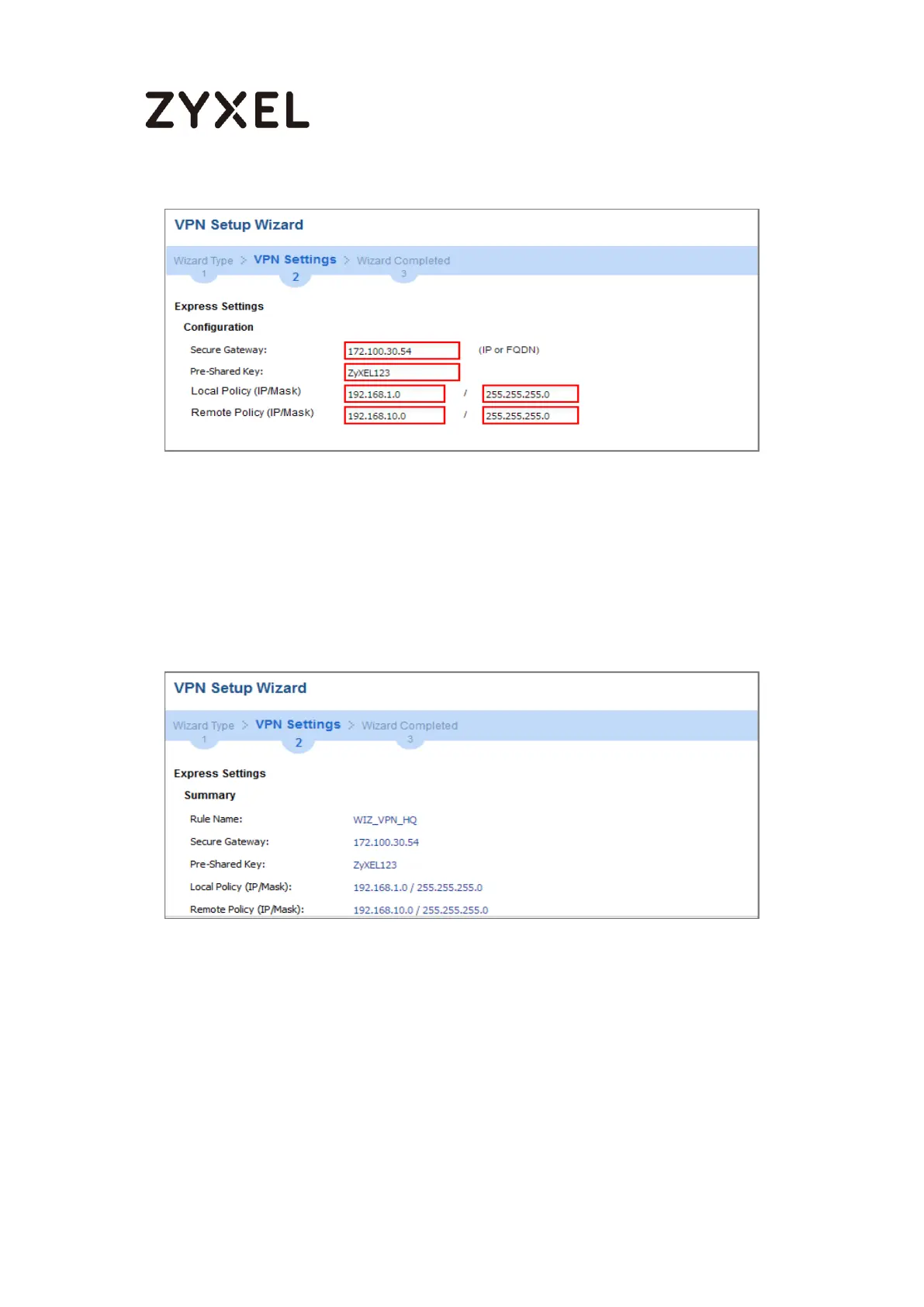 Figure 114 Quick Setup > VPN Setup Wizard > Welcome > Wizard Type > VPN Settings
