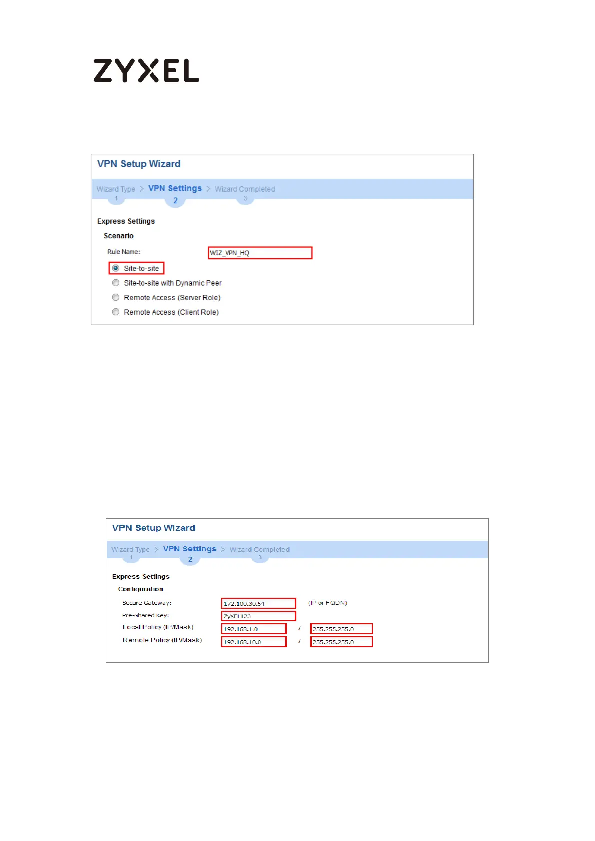 Figure 137 Quick Setup > VPN Setup Wizard > Wizard Type > VPN Settings (Scenario)
