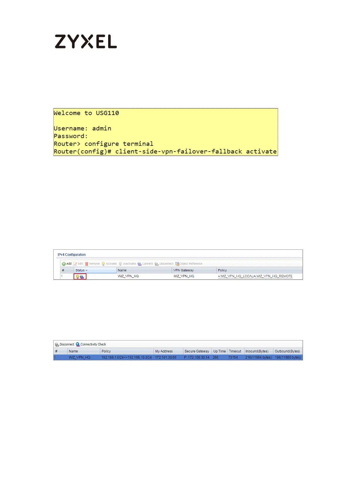 15 Go to ZyWALL/USG MONITOR > VPN Monitor > IPSec and verify the tunnel Up Time
