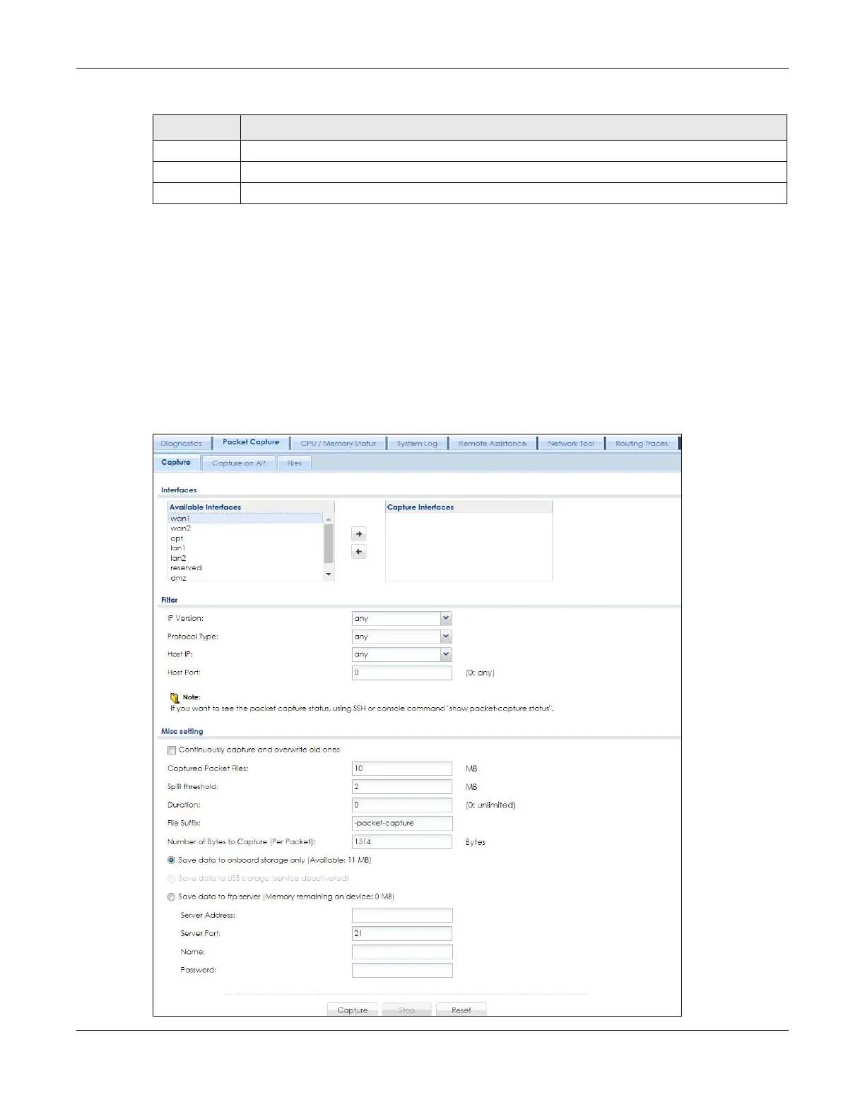 Use this screen to capture network traffic going through the Zyxel Device’s interfaces. Studying these