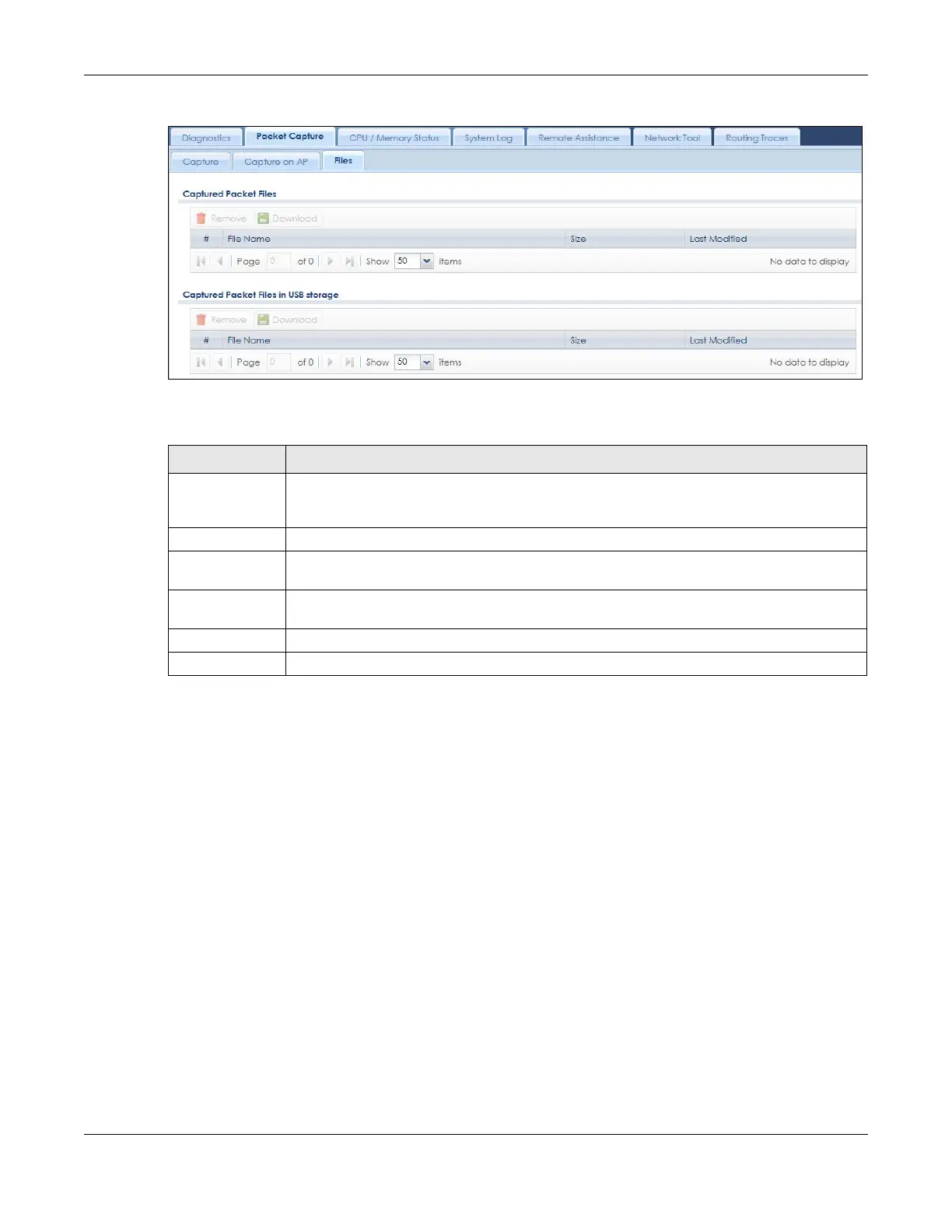 Table 408 Maintenance > Diagnostics > Packet Capture > Files