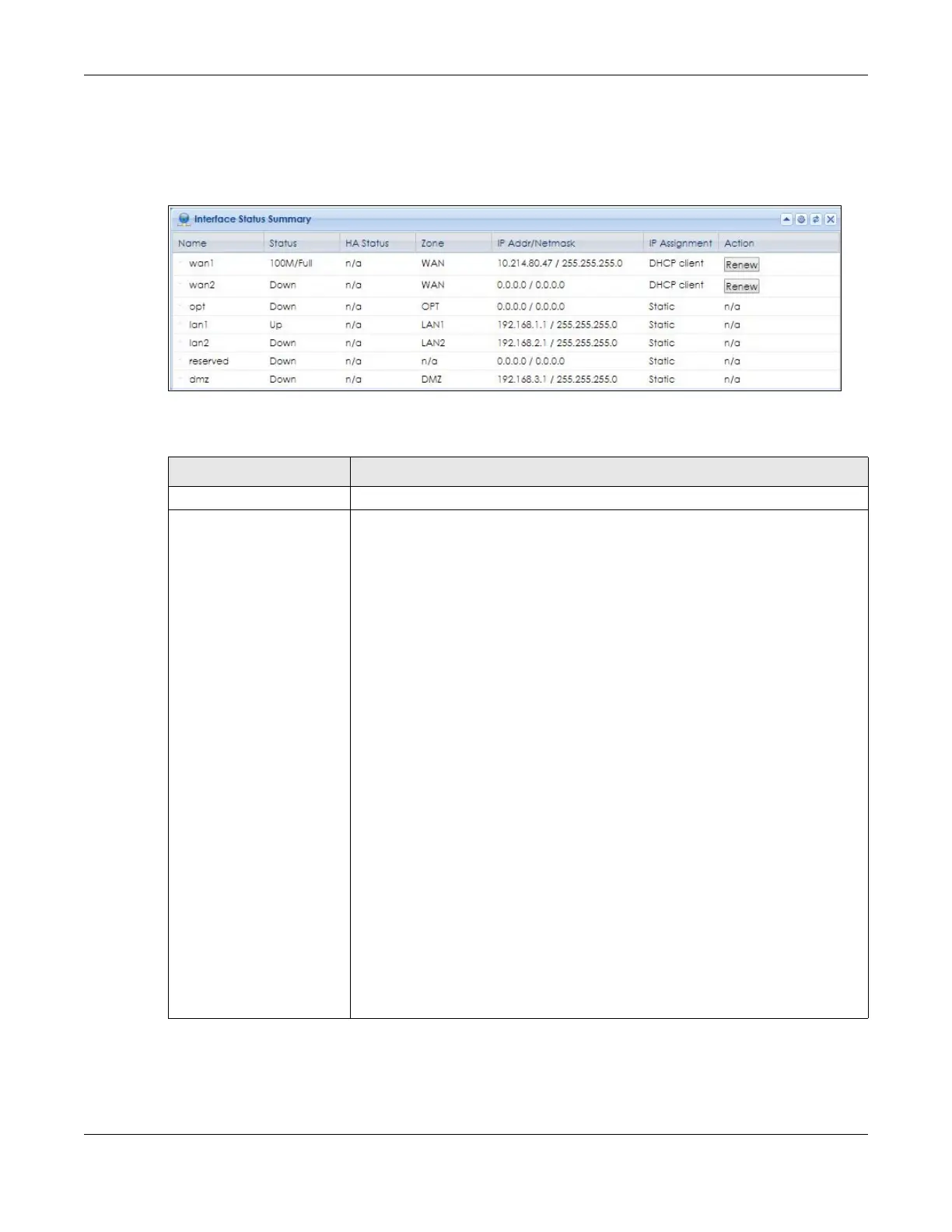 Status This field displays the current status of each interface. The possible values depend on
