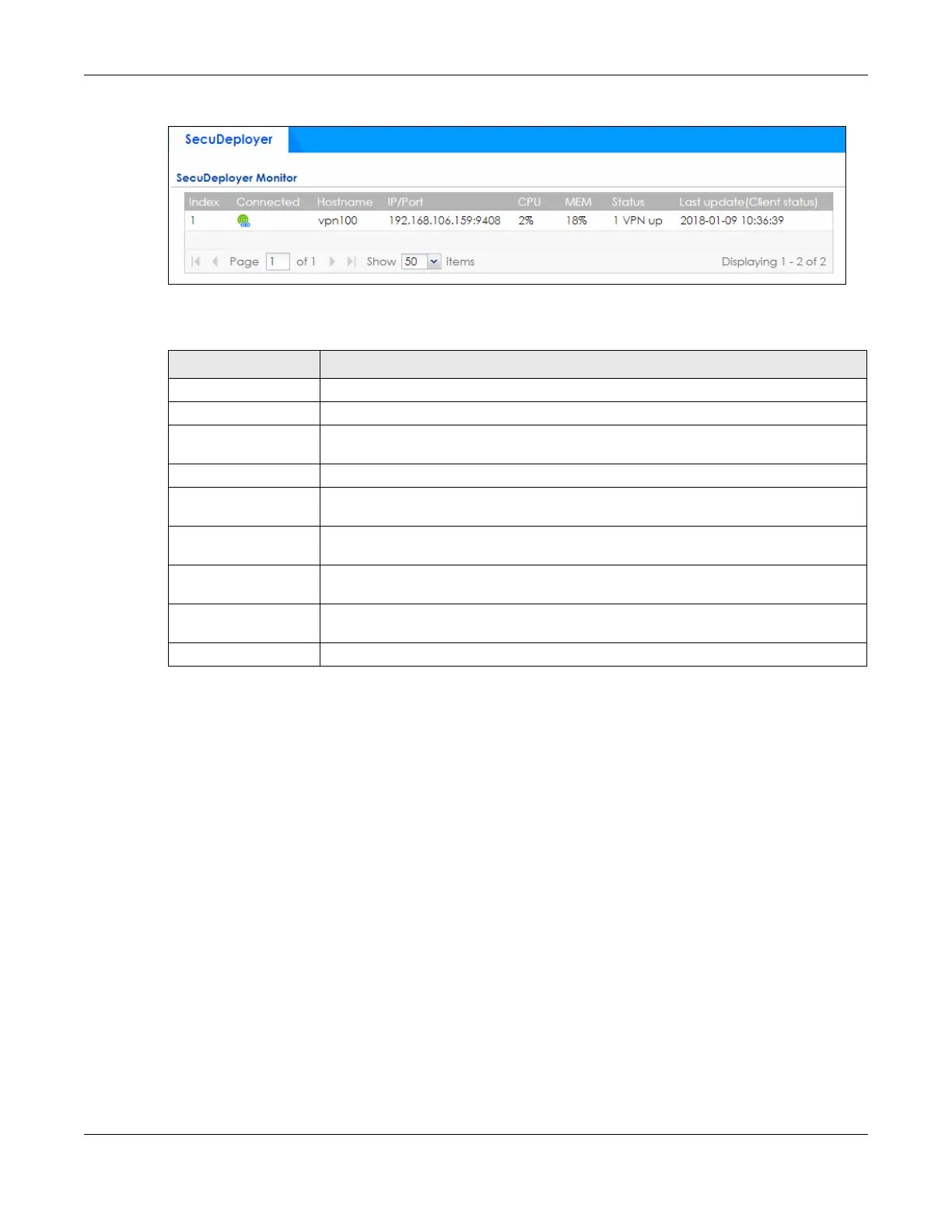 Connected This displays whether the Zyxel Device SecuDeployer client is connected to the Zyxel