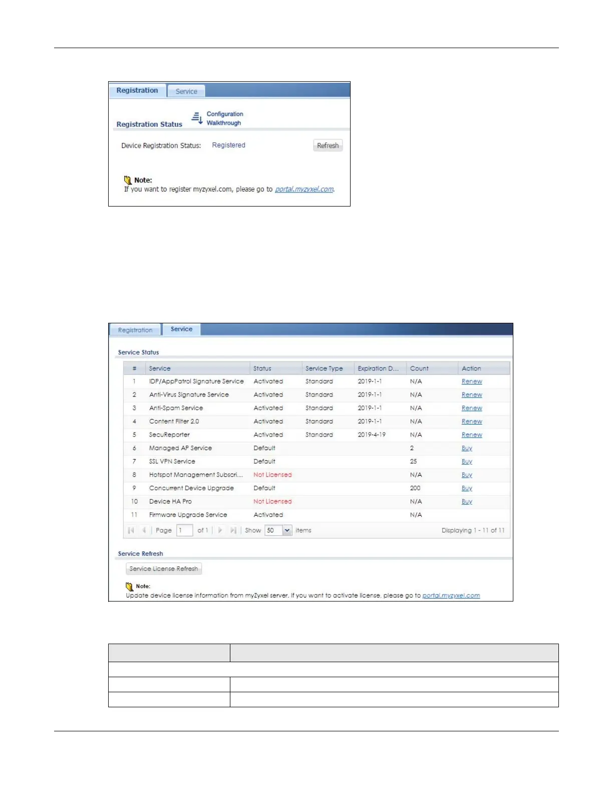 Use this screen to display the status of your service registrations and upgrade licenses. To activate or