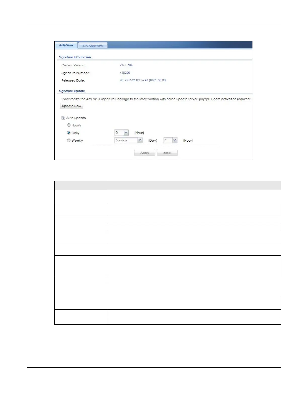Update Now Click this button to have the Zyxel Device check for new signatures immediately. If