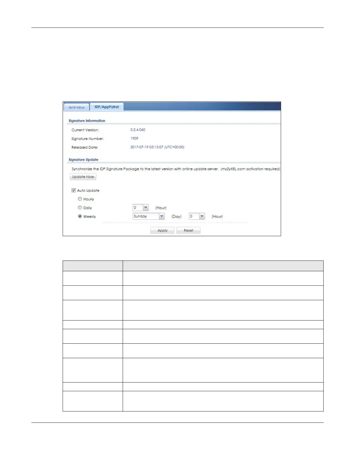 Update Now Click this button to have the Zyxel Device check for new IDP signatures immediately. If