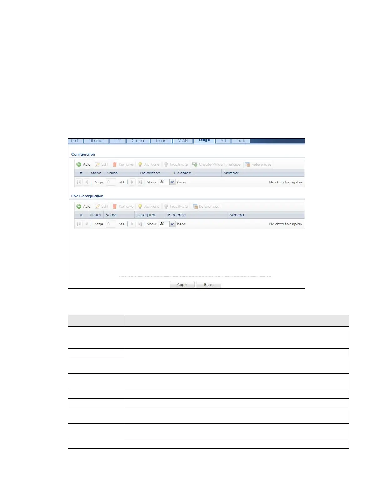 enabled IPv6 in the Configuration > System > IPv6 screen, you can also configure bridge interfaces used