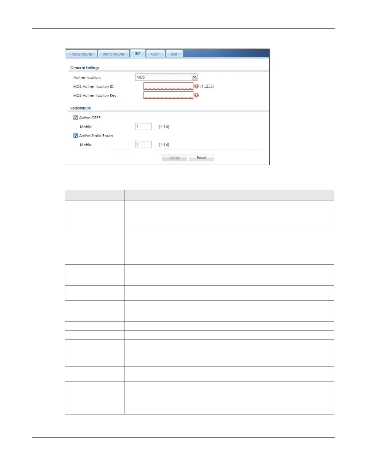 Table 143 Configuration > Network > Routing Protocol > RIP