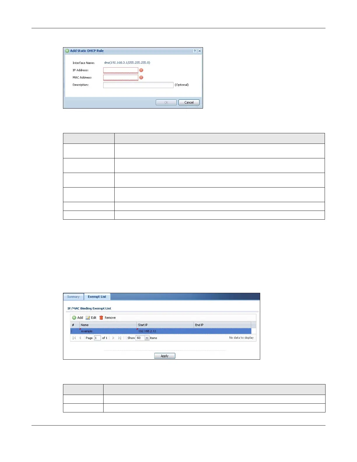 Table 163 Configuration > Network > IP/MAC Binding > Exempt List