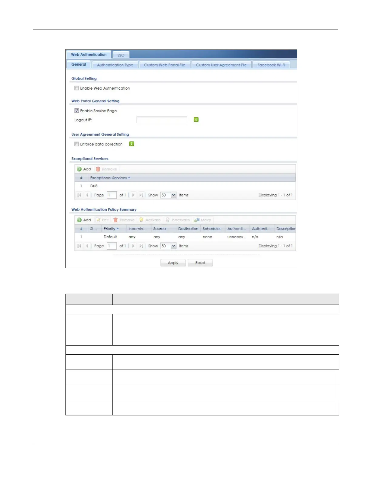 Table 170 Configuration > Web Authentication > General