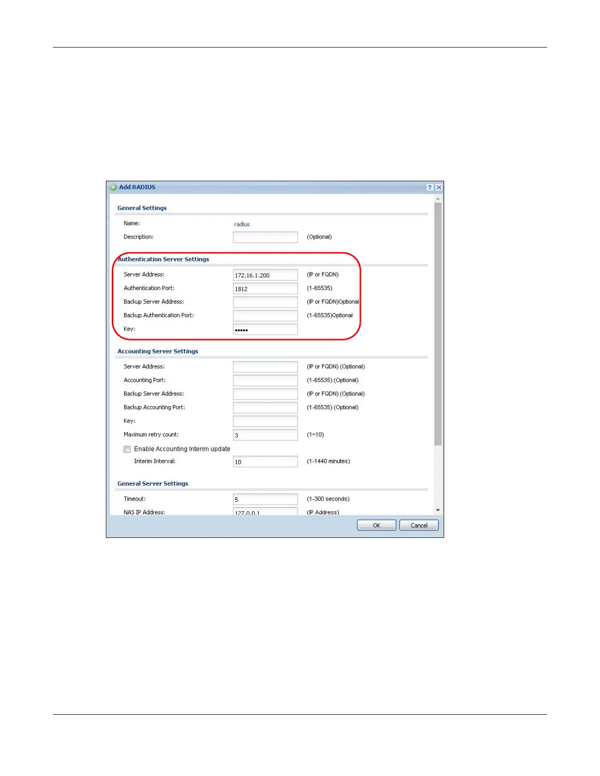 server’s address, authentication port (1812 if you were not told otherwise), and key. Click OK.