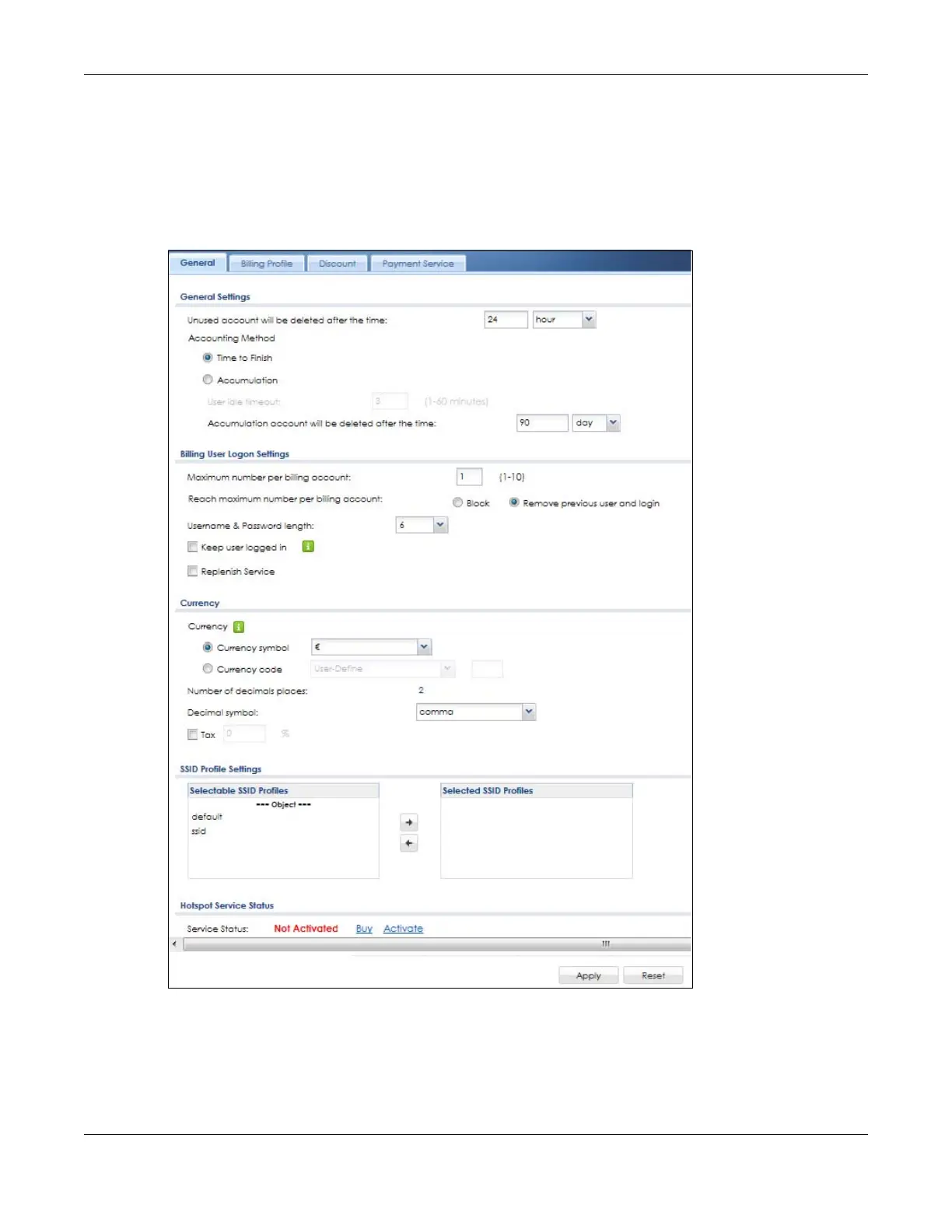 and the SSID profiles to which the settings are applied. Click Configuration > Hotspot > Billing > General