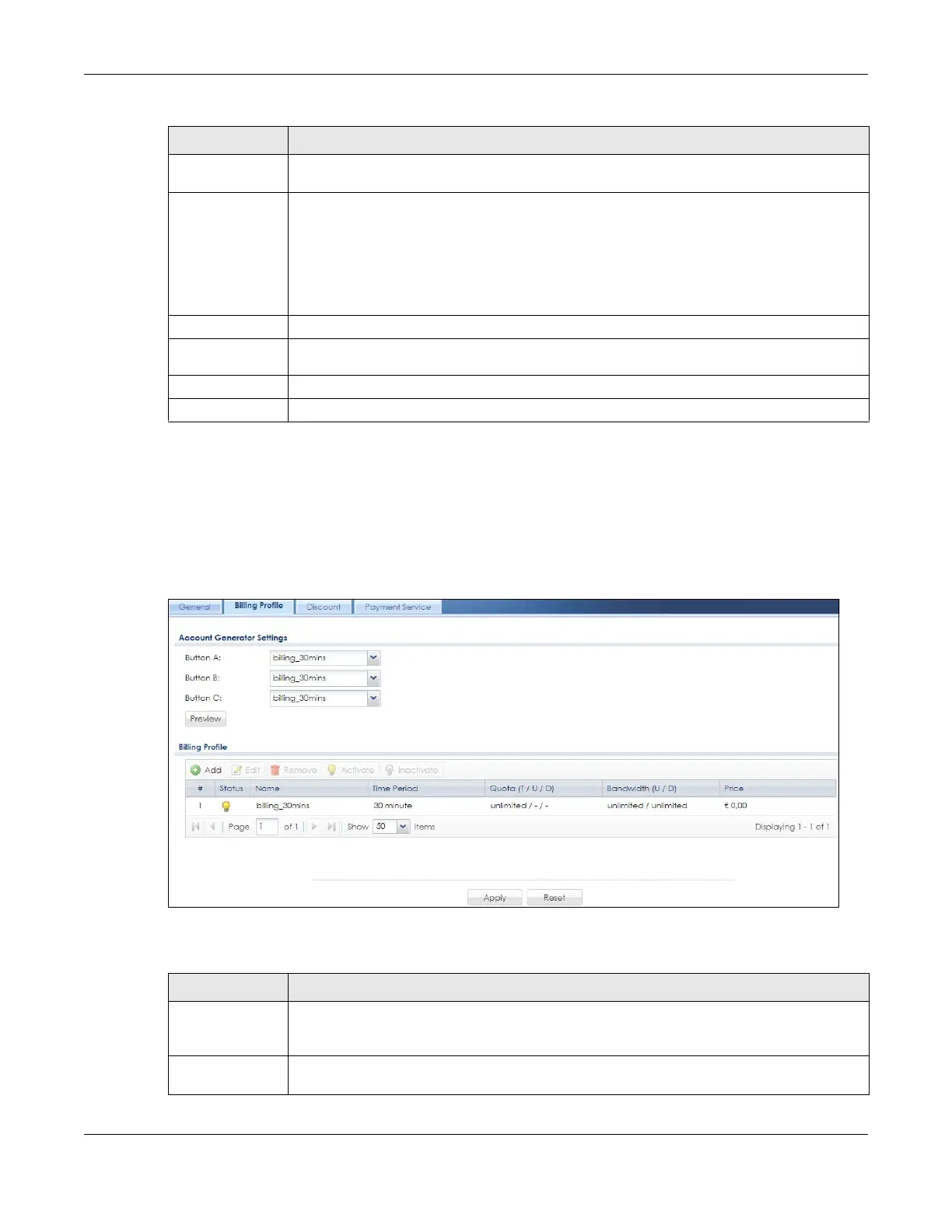 Table 179 Configuration > Hotspot > Billing > Billing Profile