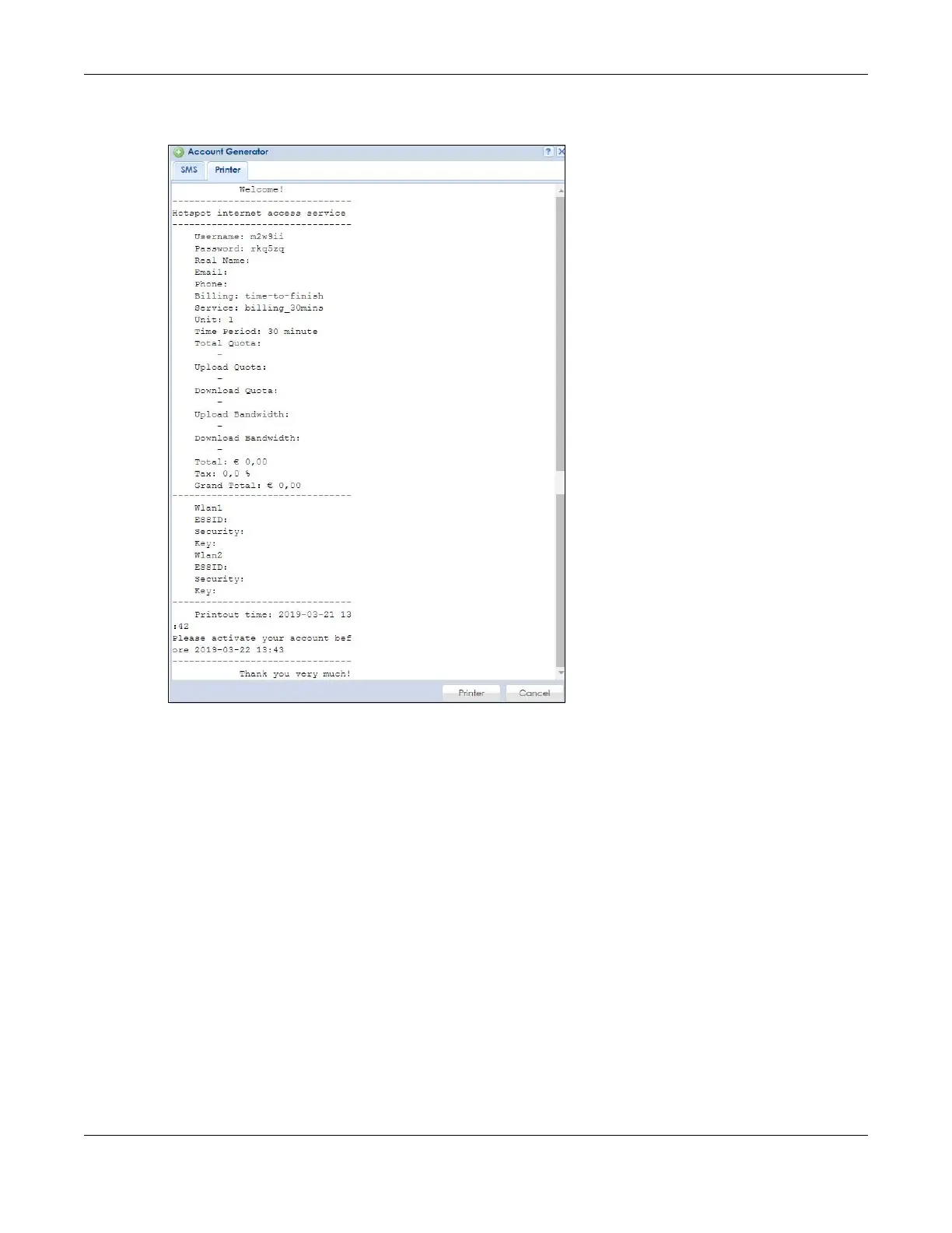 The Printer screen shows a printout preview example. Click Printer to print this subscriber statement. Click