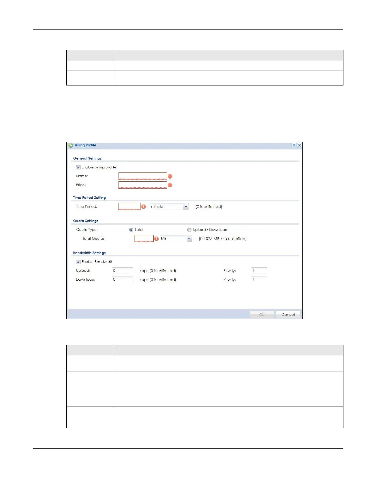 Table 182 Configuration > Hotspot > Billing > Billing Profile > Add/Edit
