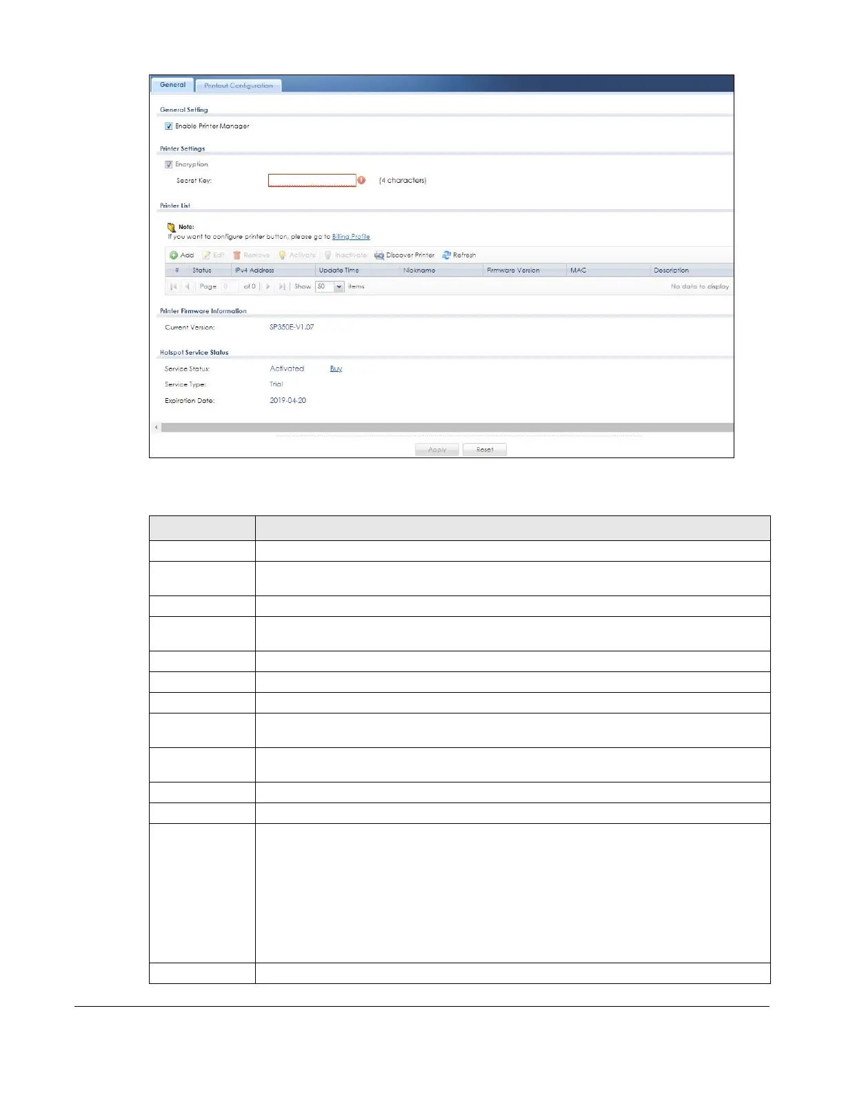 Table 187 Configuration > Hotspot > Printer Manager > General