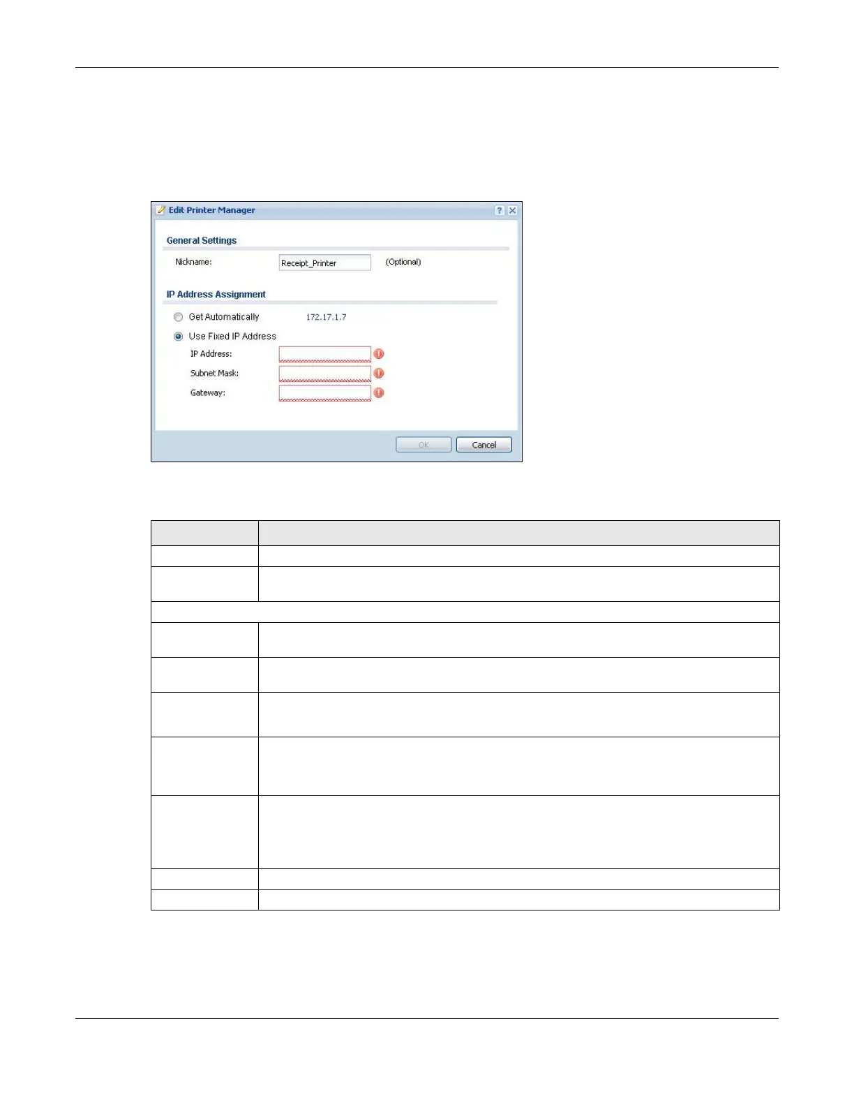 the following screen. Use this screen to modify the printer’s nickname and IP address.