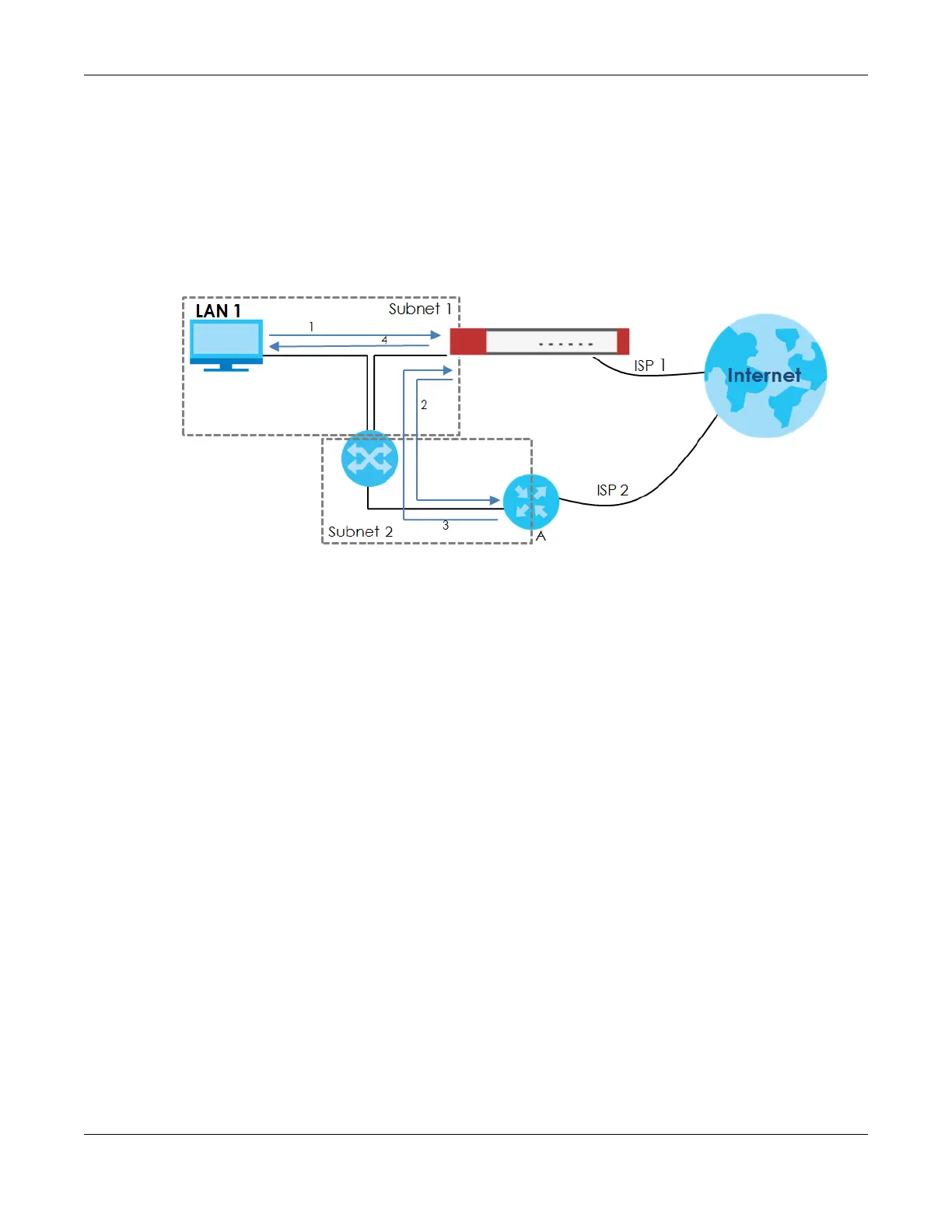 2 The Zyxel Device reroutes the packet to gateway A, which is in Subnet 2.
