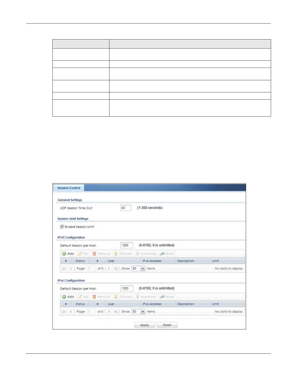 screen. Use this screen to limit the number of concurrent NAT/Security Policy sessions a client can use.