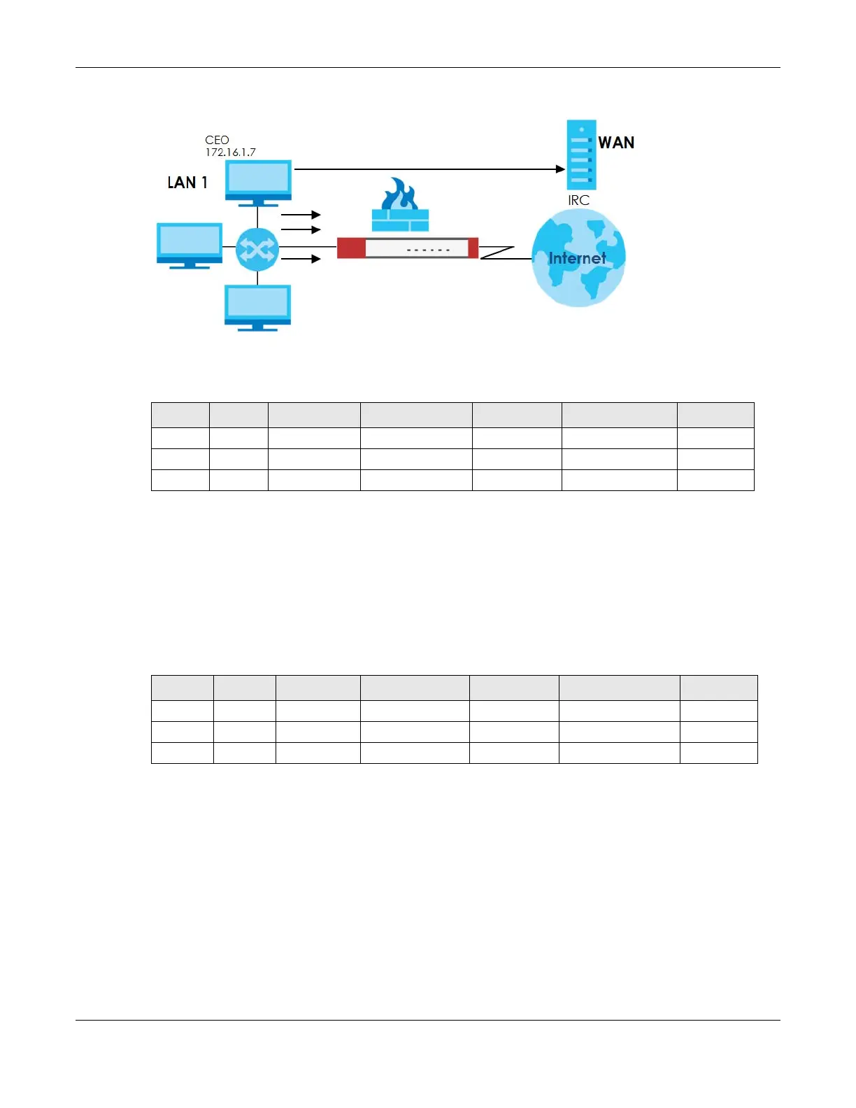 • The first row allows any LAN1 computer to access the IRC service on the WAN by logging into the Zyxel