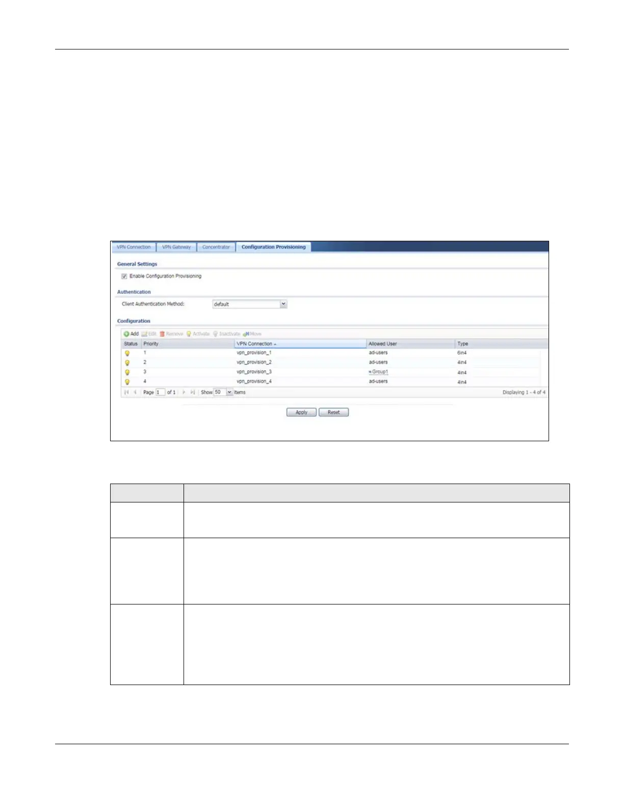Table 226 Configuration > VPN > IPSec VPN > Configuration Provisioning