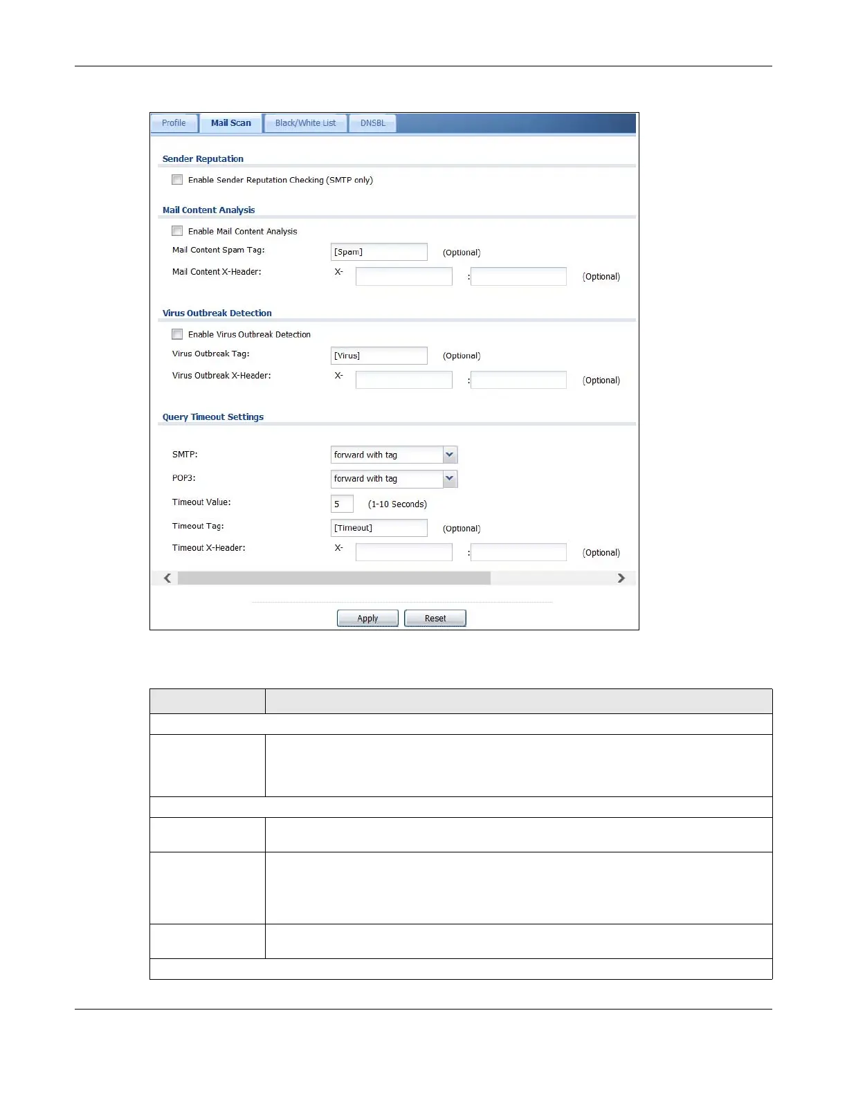 Table 277 Configuration > UTM Profile > Anti-Spam > Mail Scan
