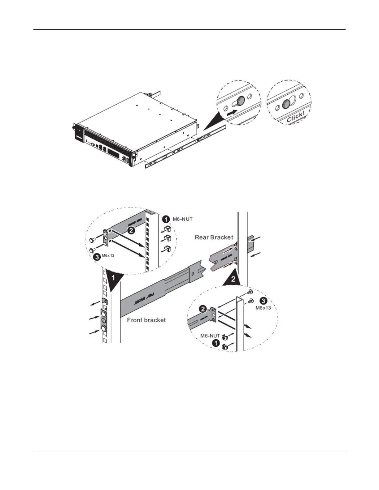 4 Connect the front of an outer railing to the front of the rack using the M6 rack screws. Similarly, connect