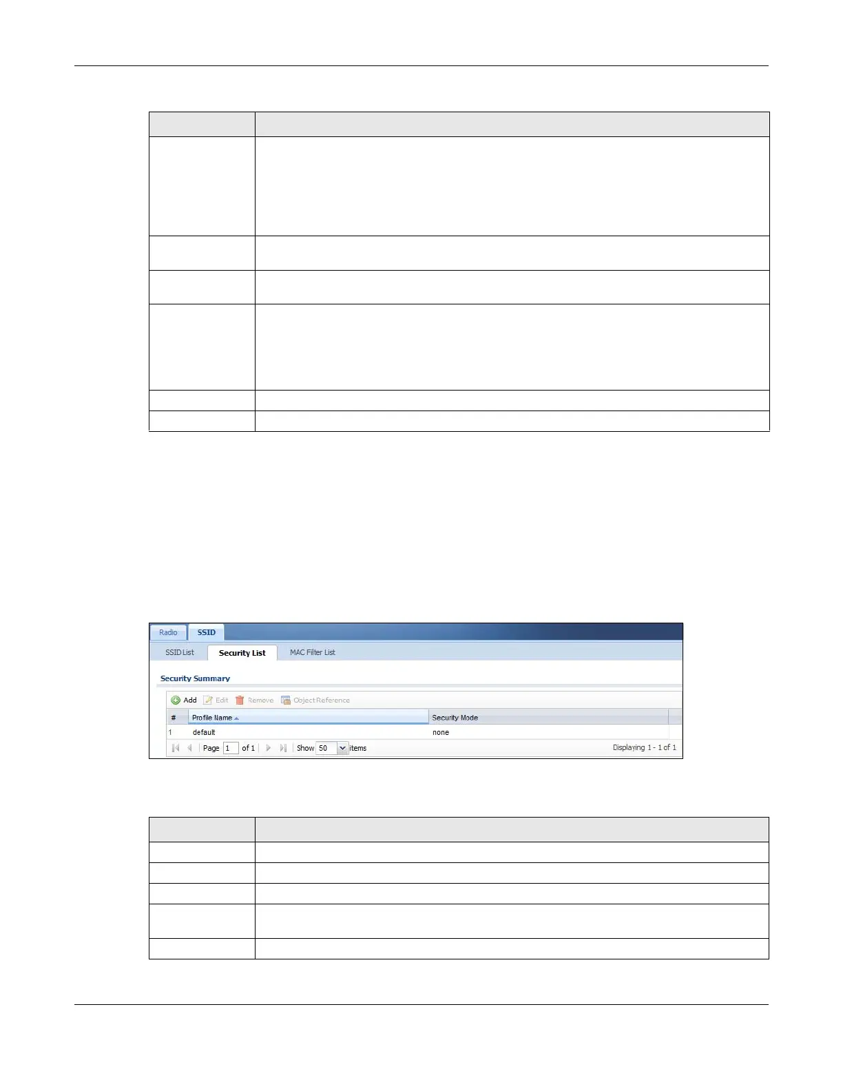 Table 308 Configuration > Object > AP Profile > SSID > Security List