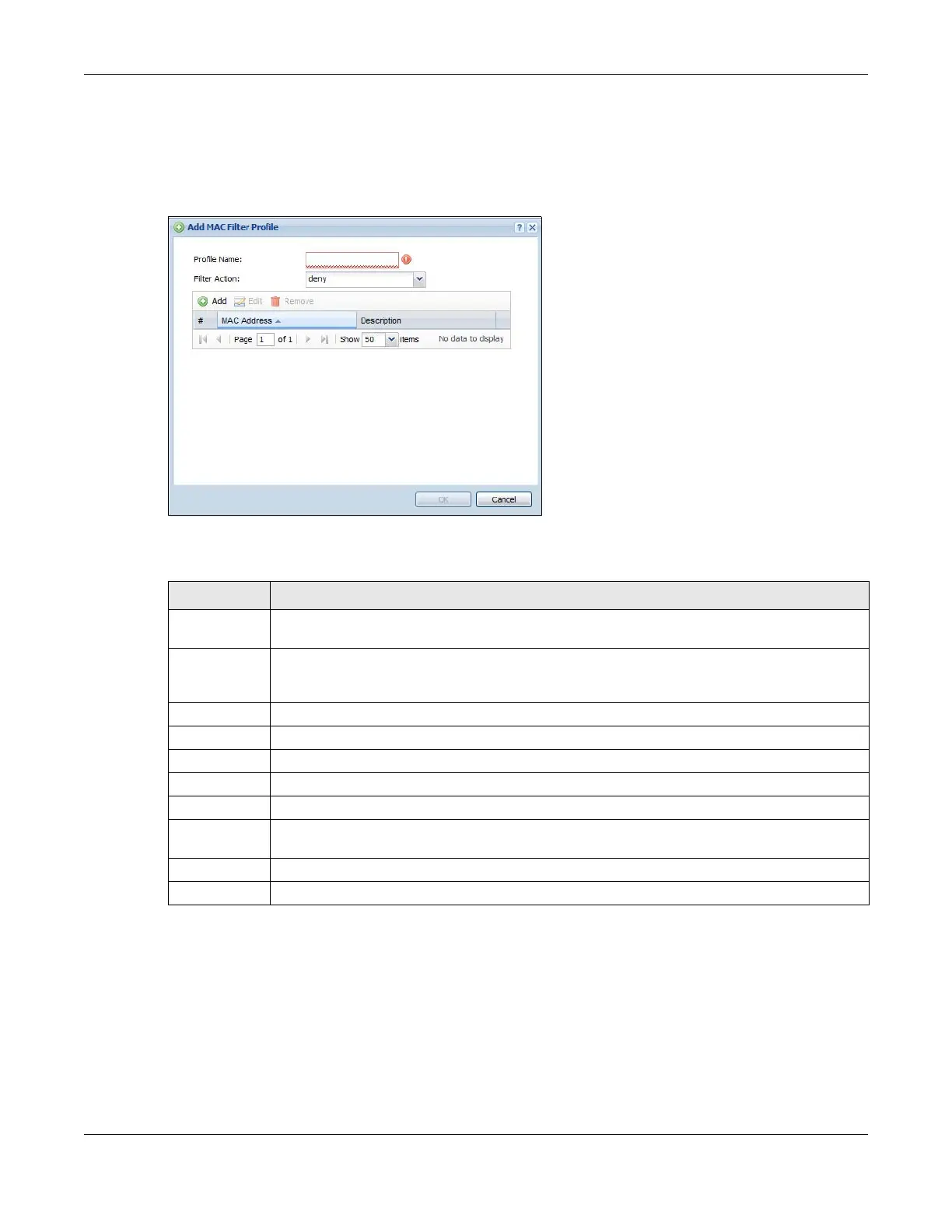 Table 311 SSID > MAC Filter List > Add/Edit MAC Filter Profile
