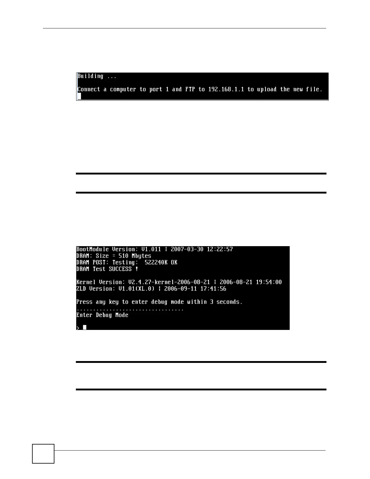 2 When “Press any key to enter debug mode within 3 seconds.” displays, press a key to